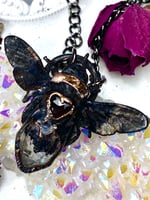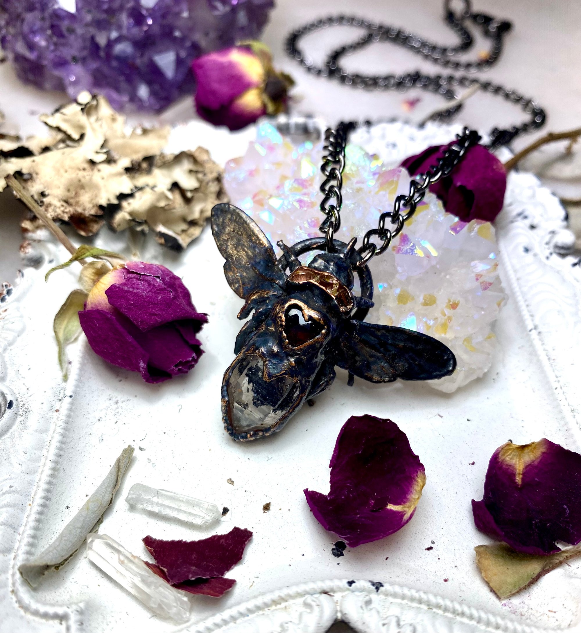 A real Blue BubbleBee Queen immortalized within dark, luscious copper. Herkimer Diamond bum bum, faceted Garnet thorax, and mini Herkimer Diamonds crown her sweet little head.