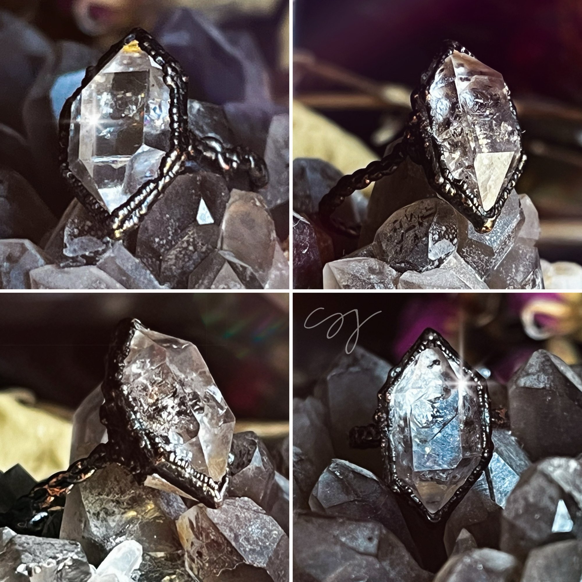 Natural pepper black inclusions dance among rainbow inclusions within this Herkimer Diamond. Truly stunning in every light - sparking magically shifting crystal worlds within.