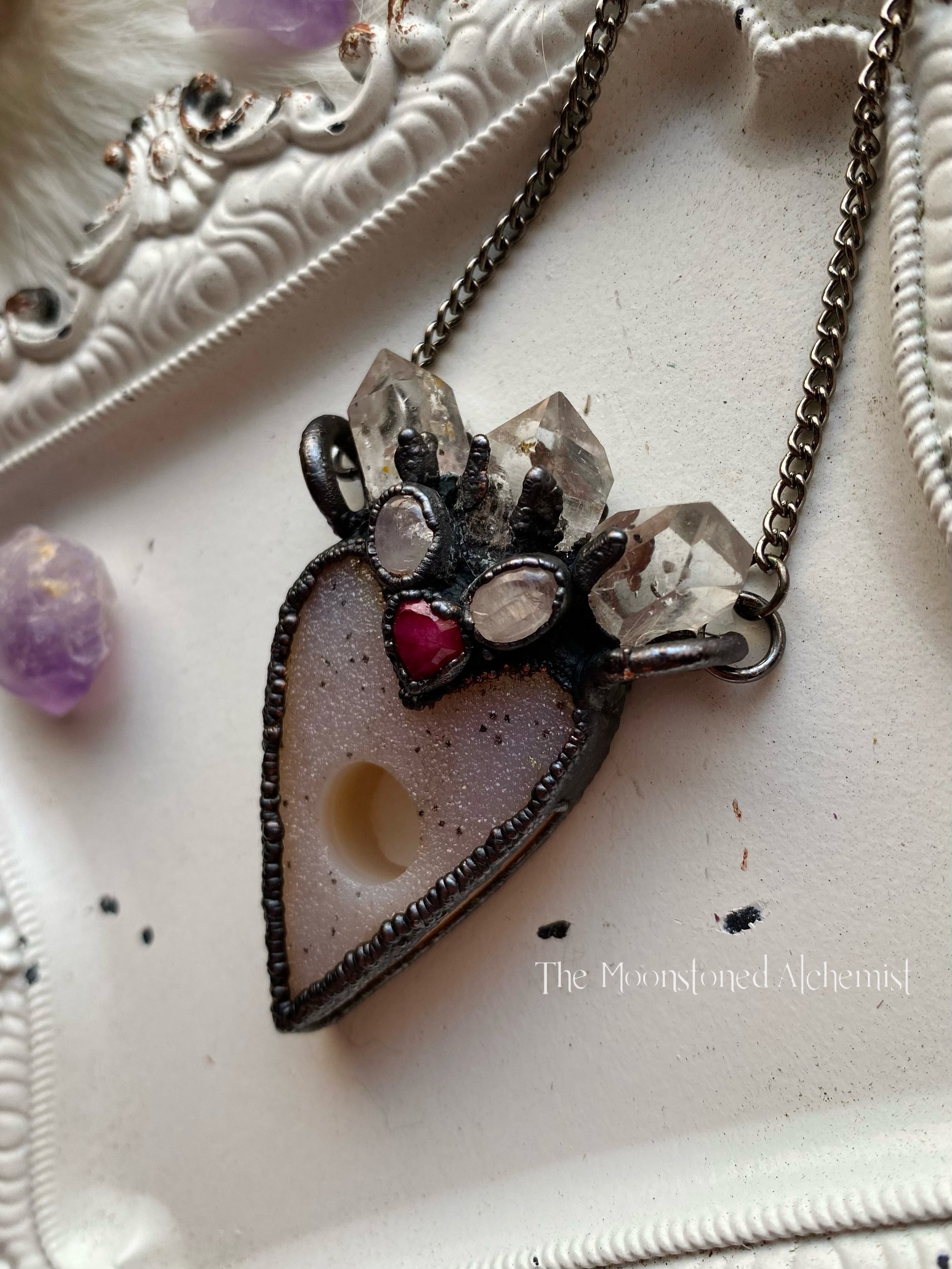 Druzzy Quartz hearts embellished with faceted Garnets, flashy moonstones, and crowned with STUNNING Herkimer Diamonds. Set in dark, luscious copper.