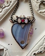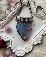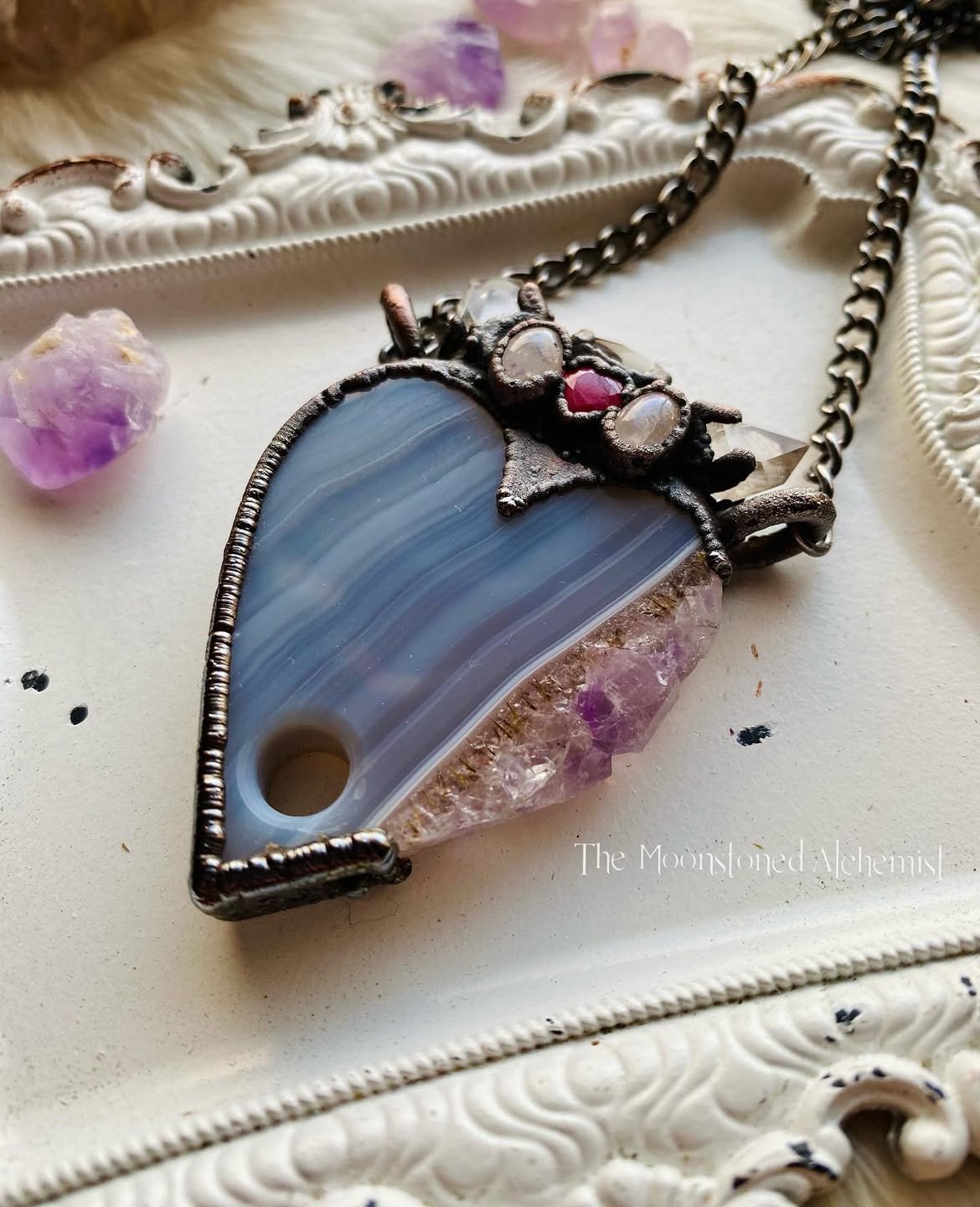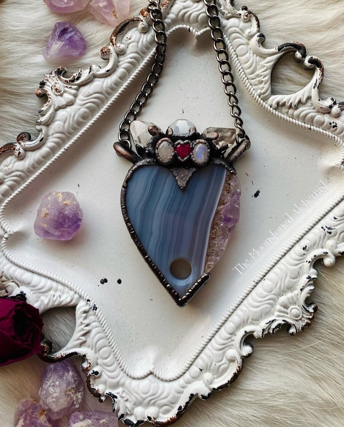 Large (around 2”x2”) Raw edge Amethyst with stunning details. Crowned with HERKIMER DIAMONDS, Moonstone, and a brilliant Garnet heart shaped gemstone.